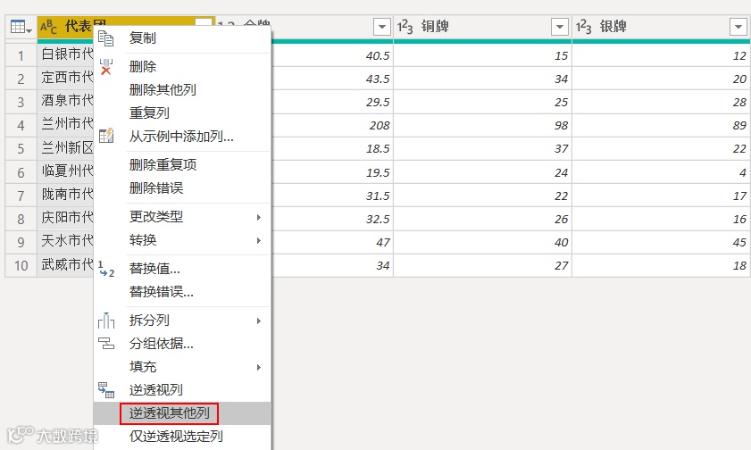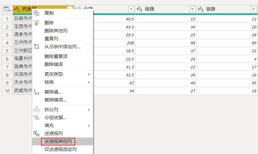 我们需要将数据进行聚合,也就是将三列奖牌榜数据聚合为两列,一列为奖牌的品类,一列是奖牌的数量,右键代表团这一列,点击逆透视其他列。