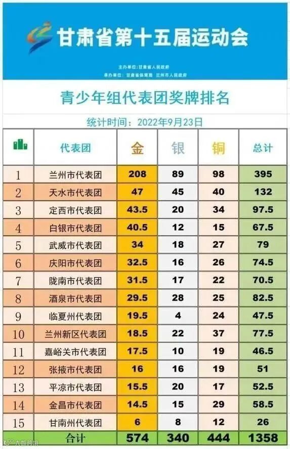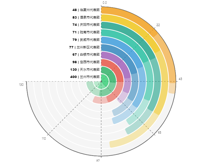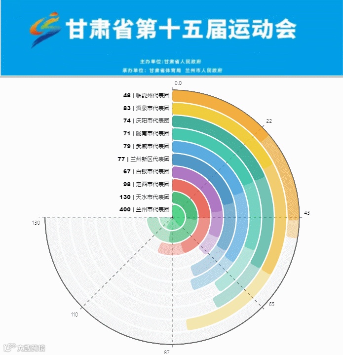 如下即是使用PowerBI视觉对象制作的动态径向条形图,这里是使用圆环的弧度来表示奖牌的数量大小,由图可以看到兰州市代表团的的奖牌数最多,有400个,接下来是天水市代表团,有130个。