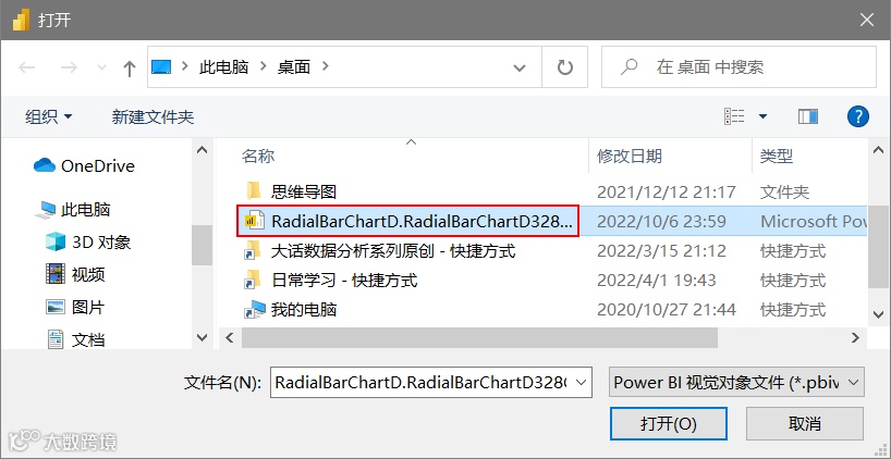 导入Dynamic Radial Bar Chart视觉对象,制作动态径向条形图,点击可视化中的三个点 ...,点击从文件导入视觉对象。