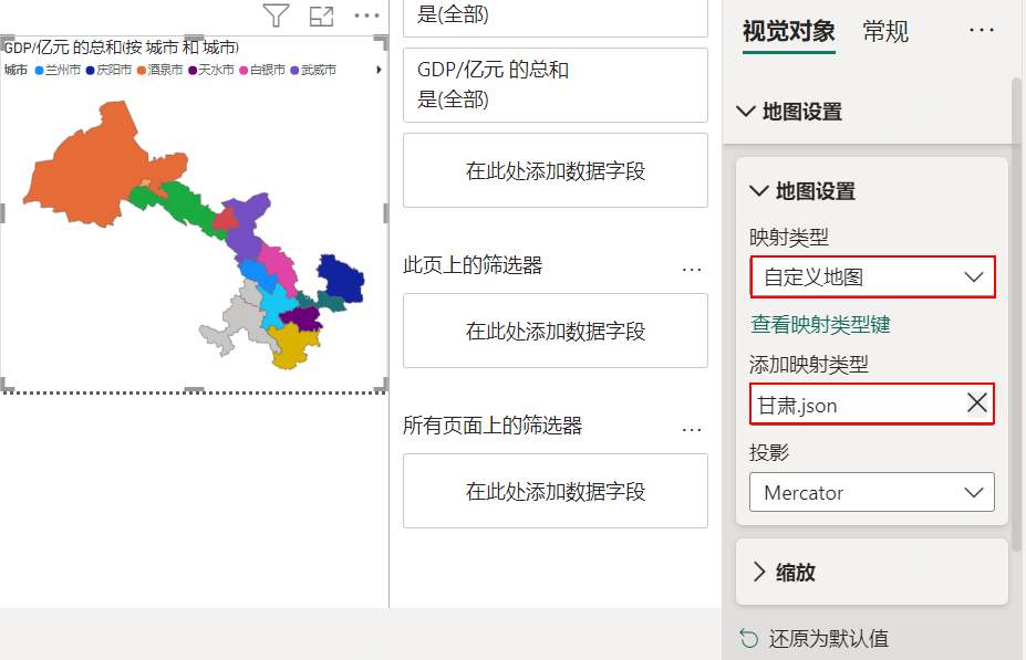 在映射类型里选择自定义地图,将之前生成的甘肃省的.json文件添加到映射类型中。