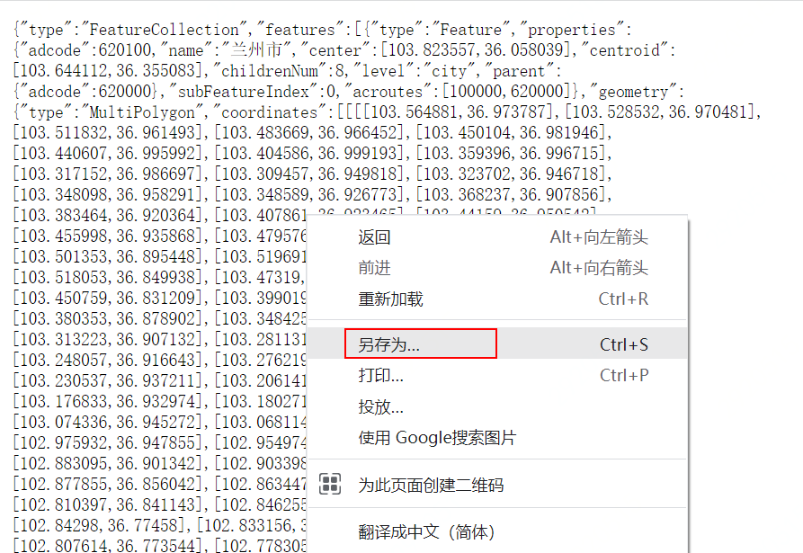 如下为甘肃省JSON API数据,将该链接复制到网页地址,可看到包含很多数据,点击另存为,将其保存为. Json的格式。