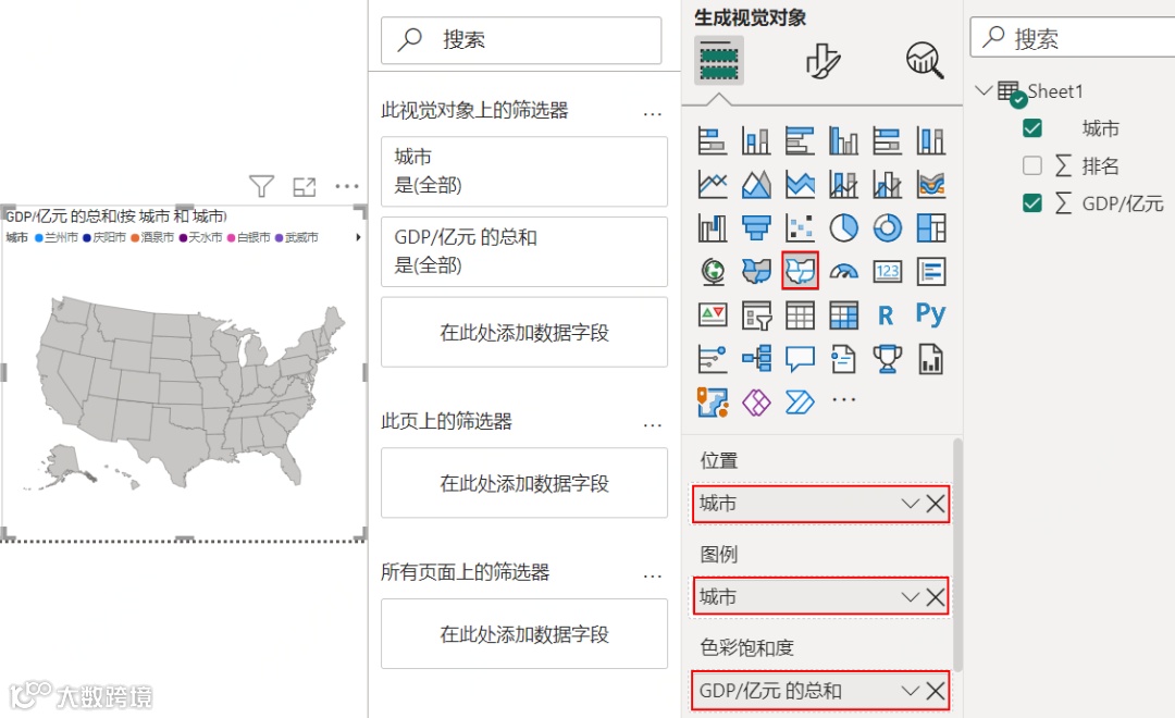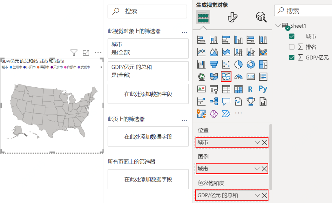 在视觉对象中点击形状地图,将城市字段拖入到位置,将城市字段拖入到图例,将GDP数据拖入到色彩饱和度。