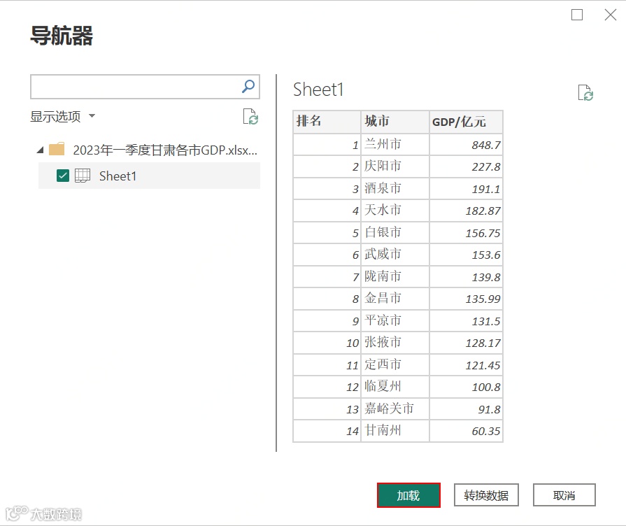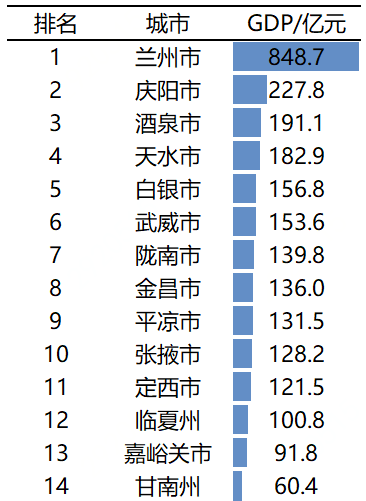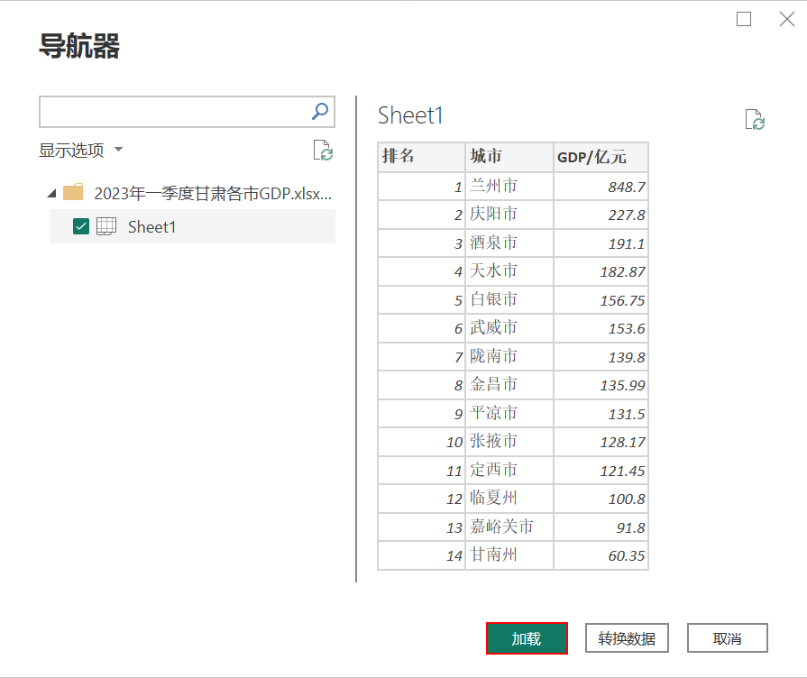 如下是2023年一季度甘肃各城市GDP的Excel数据,将其在形状地图上进行呈现。