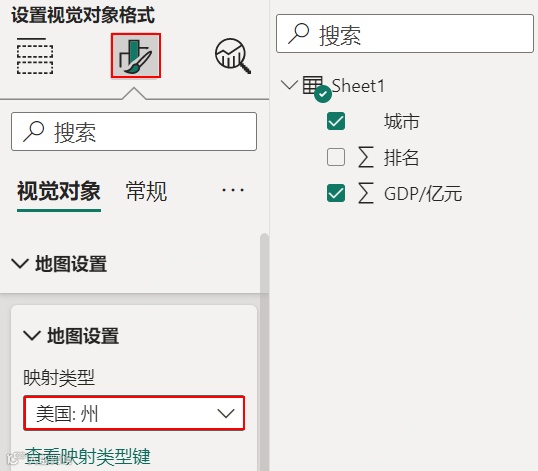 默认的地图形状是美国地图,点击设置视觉对象格式,在地图设置里设置映射类型。