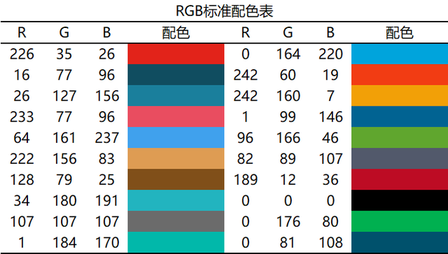 具体的需要突出重点数据,可以使用这里归类的RGB标准配色表,选择这里的数据配色,可以将需要重点突出的数据标记出来,从而在视觉上呈现数据的差异点。