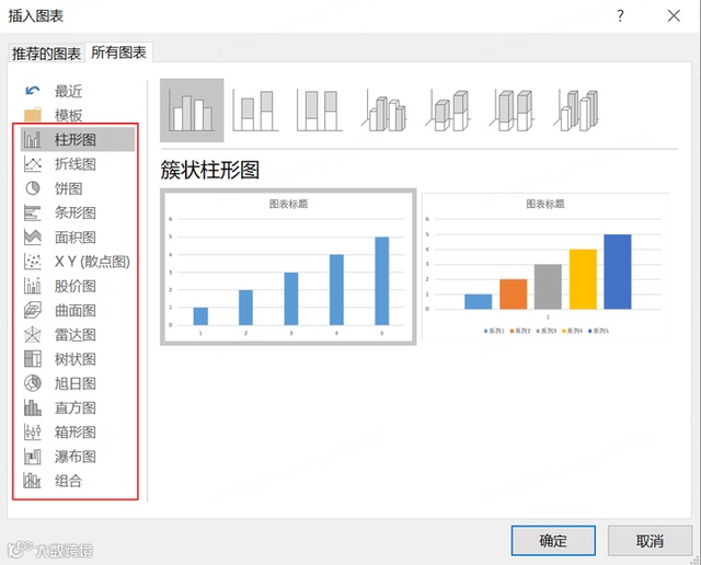 图表选择建议以上几个基本的图表涵盖了目前我们使用的绝大多数图表,点击Excel中插入图表,这里有常见的Excel图表类型,包含柱形图、折线图、饼图、条形图等基本图表类型,还有面积图、散点图、雷达图、树状图等高级图表,选择恰当的图表类型用于图表创建。