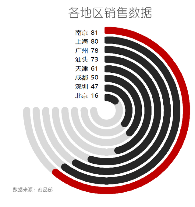 除此之外,突出重要数据在扇形图中也可以在扇形图展示出来,下面的扇形图展示的是各地区销售数据,这里突出展示的是南京地区的销售数据高,可以使用红色来标记突出显示,其他不需要突出展示的可以使用黑色,以此来突出展示重要数据。