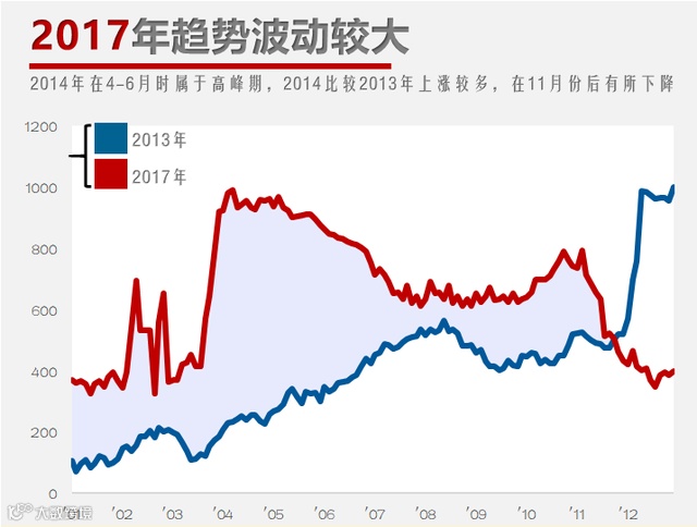 如下展示的销售量折线图,将多余的数据标签图表元素剔除,仅用折线图来展现2013年和2017年销量的波动趋势,从趋势上可直观的反应出2017年的趋势波动比较大,由于这里仅展示数据的波动趋势,剔除数据标签是合适的,这样在图表创建上更加简洁和直观。