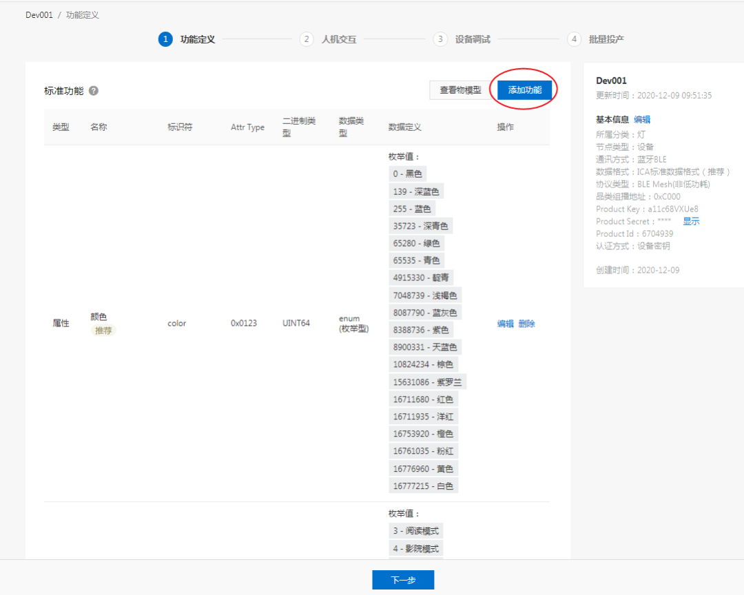 根据上面多获取的数据协议,我们打开平台上的设备调试,直接发Opencode和参数的命令对已配对天猫精灵的BLE设备进行操控。