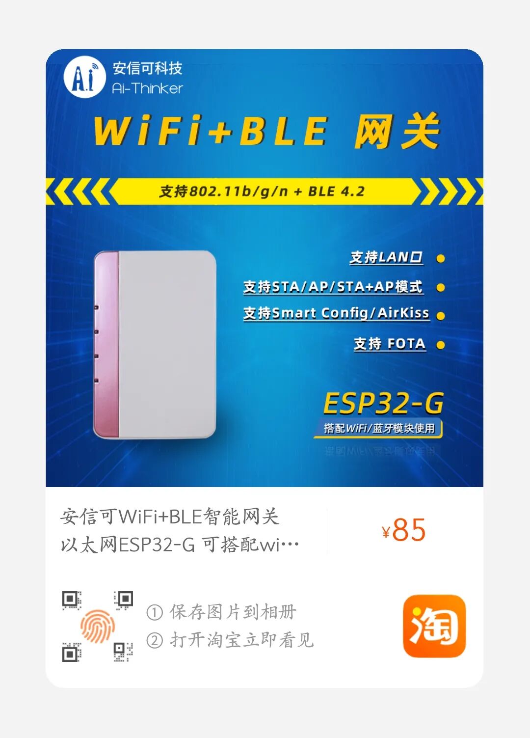 如需了解ESP32-G在WiFi模式和蓝牙模式下分别如何进行工作,可前往官网下载产品规格书:https://docs.ai-thinker.com/blue_tooth_gateway