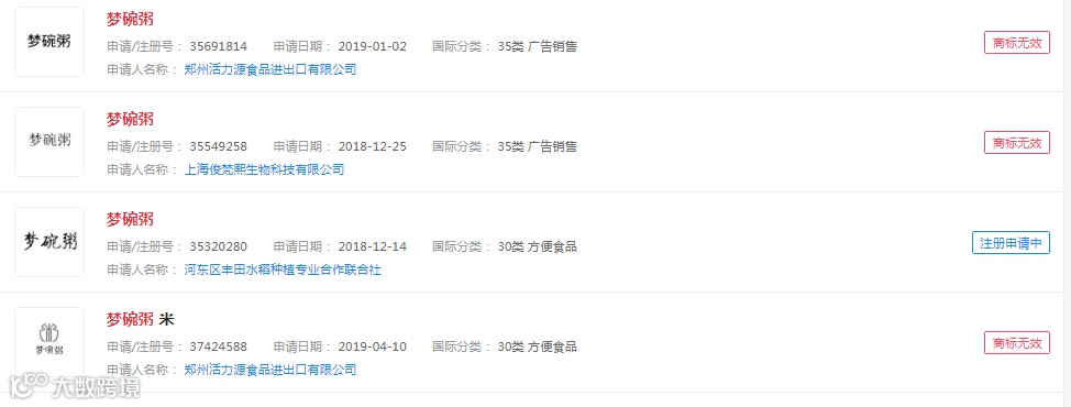“梦晚舟”还不够,蹭名的套路从来都是没有界限的,三个字任意换一到两个同音字,抢注走起!比如“萌晚舟、孟婉舟、梦晚周、梦晚洲”商标,甚至还有人申请“梦碗粥”、“梦碗粥米”商标。
