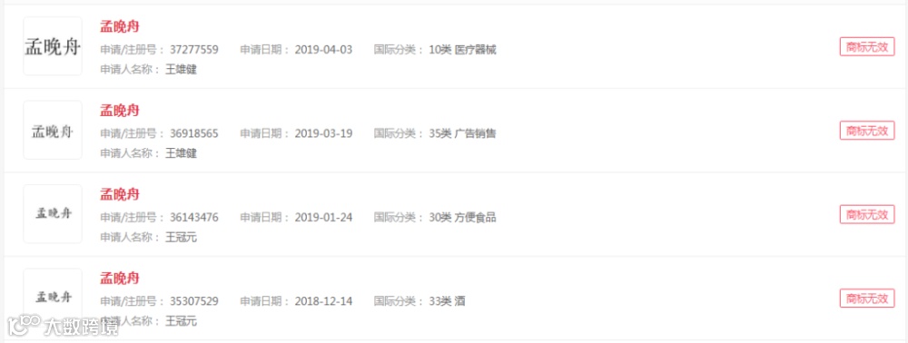 查询企查查信息显示,从2018年12月14日开始,第一个“孟晚舟”商标被人抢注商标,到目前为止一共4个“孟晚舟”商标申请信息。目前这些商标都处于“商标无效”状态!