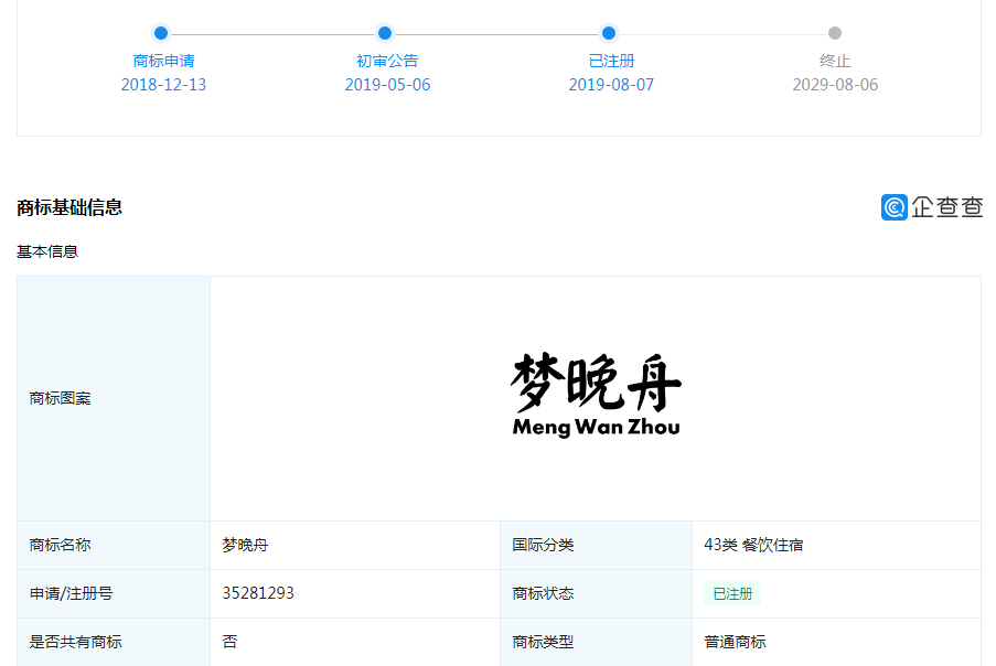 同样的商标名不同的结局,显然商标审查是有主观因素的,且遵循个案审查原则!两个成功注册“梦晚舟”商标,分别涉及第43类餐饮注册和第33类酒类别,商标专用权日期都是2019-08-07 至 2029-08-06。