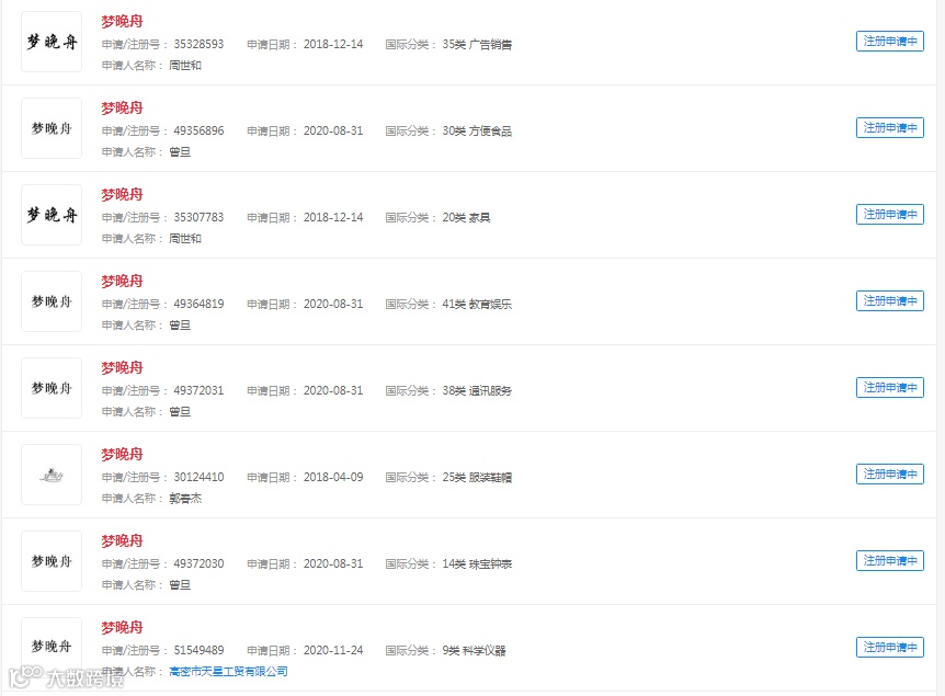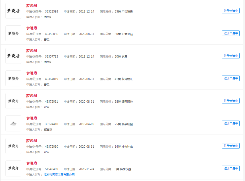 “孟晚舟”行不通,有人开始打“梦晚舟”的主意!查询2018年12月以后,“梦晚舟”商标被申请达16个,其中8个商标处于“注册申请中”,5个商标被无效,还有两个竟已申请成功!
