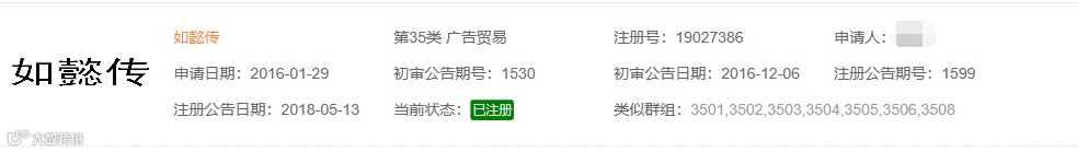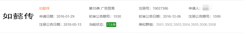 此前就有人扒出来,在《如懿传》关联方注册商标之前,已经有几个“如懿传”商标成功注册,甚至连被称为“万能商标”的第35类“如懿传”商标也于2016年1月申请注册,并于2018年5月注册成功,注册号为19027386。就是这枚“如懿传”商标,被传标价1.5亿。