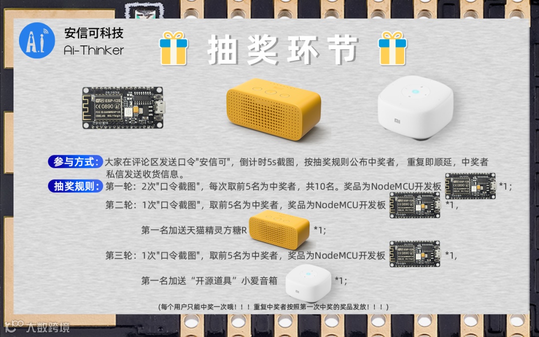 观看直播参与抽奖,有机会领取开发板、天猫精灵等奖品哦,还有在线答疑环节!!!