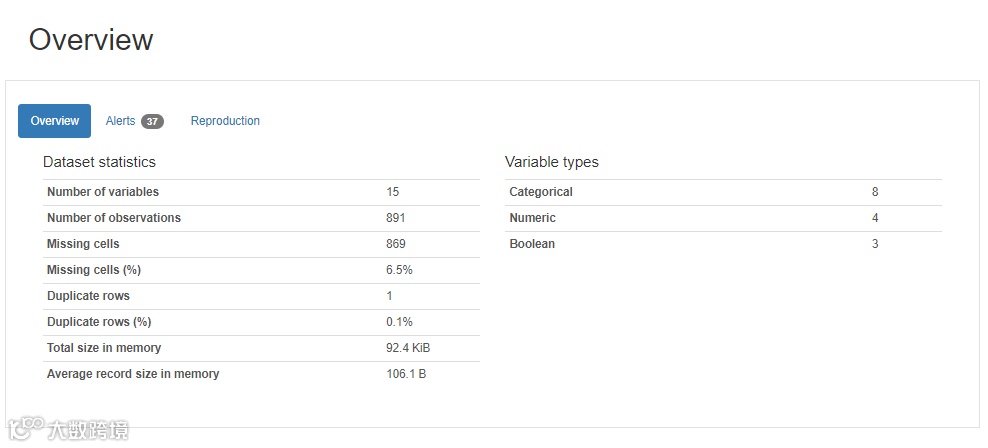 2、数据类型的分布情况:每个变量的详细情况,包括数据类型,分位数统计值、描述性统计值等,这个板块包含的信息最多。