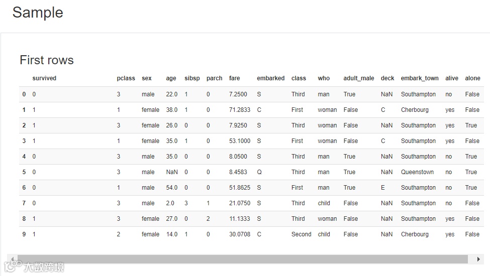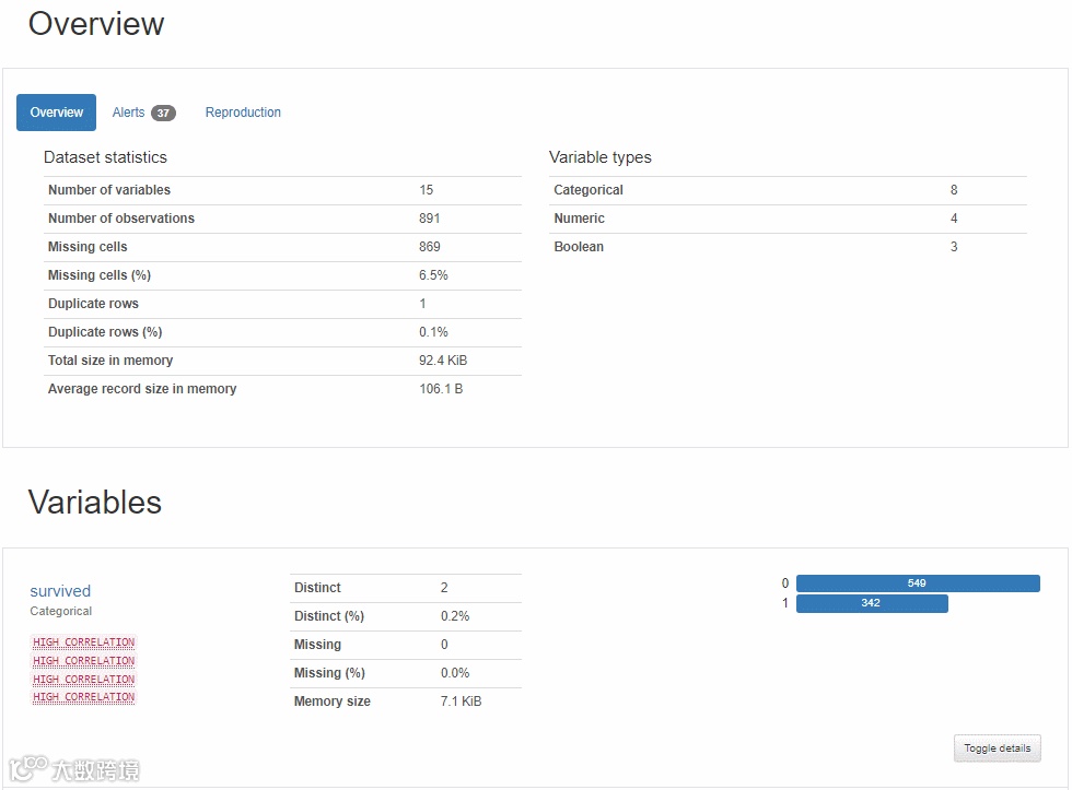 from pandas_profiling import ProfileReportprofile = ProfileReport(df,title='泰坦尼克号')profile.to_file(r'C:\Users\尚天强\Desktop\泰坦尼克号数据分析报告.html')