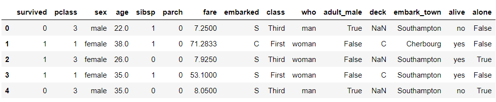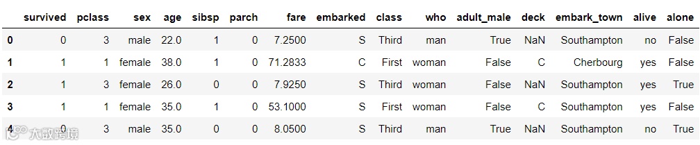 import pandas as pddf=pd.read_csv(r'C:/Users/尚天强/Desktop/seaborn数据集/titanic.csv')df.head()