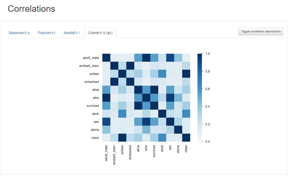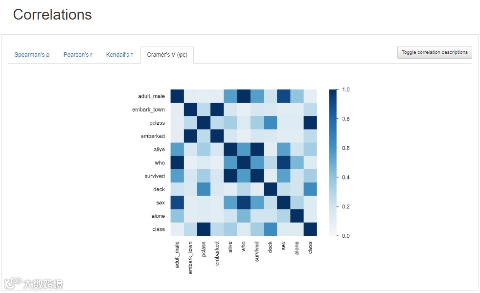 同样还有Spearman,Pearson矩阵相关性色阶图,也用来可视化数据变量之间的关系。