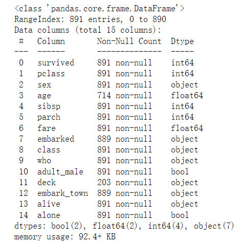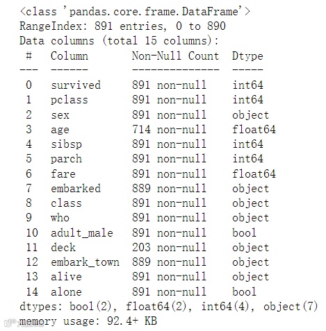 其次使用df.info()可以查看各个字段的数据类型和数据缺失值情况等。