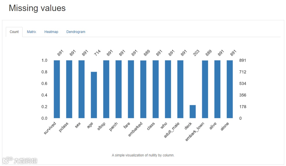 4、缺失值可视化:对于各个字段的缺失值进行分析,这里也考验我们对于缺失值如何做处理,因为缺失值会影响我们的结果分析,如果说一个字段的缺失比例大于30%,该字段应废弃处理。
