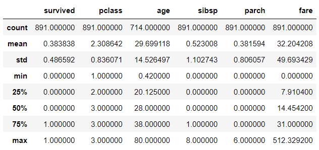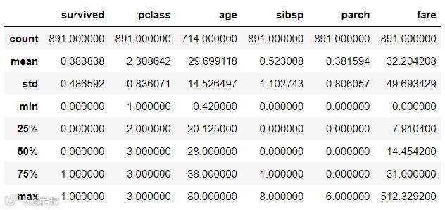 我们首先使用df.describe()函数进行数据探索分析,可以得出平均值、中位数、众数,四分位数等值。