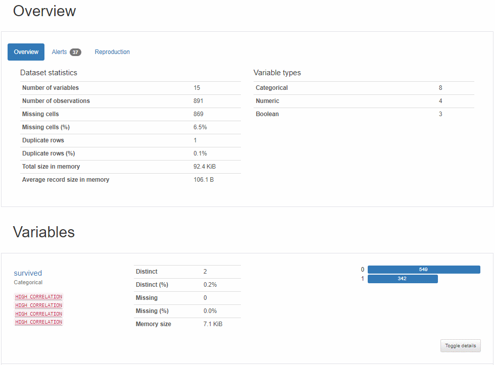 本节使用到的库是pandas_profiling库,它可以做延展性的数据探索分析,仅需三行代码即可生成一份具有交互式效果的HTML报告,简单几步就可以实现,轻松实现数据探索分析。