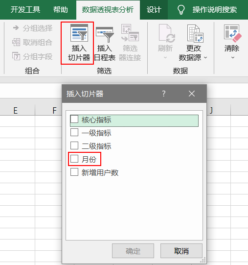 同时插入一个切片器,勾选月份,用于月份切片,展示随月份新增客户数变化情况。