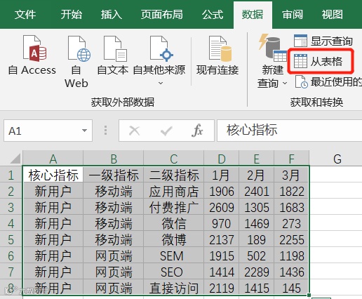 我们拿到的数据是以月份排列的横向数据,需要将其转化为纵向数据,圈选数据,在数据选项卡下点击从表格。
