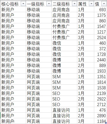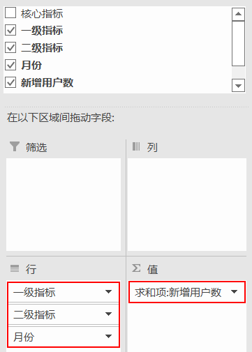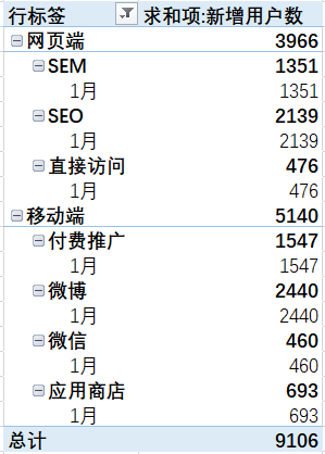 我们要得到网页端和移动端在不同推广渠道的每个月的客户数是多少,在数据透视选项卡中将一级指标、二级指标、月份拖入行,新增客户数拖入到值。