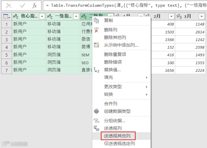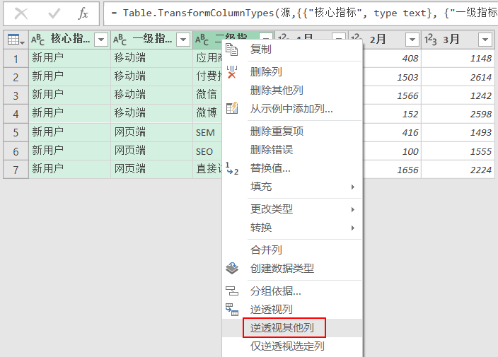 如下我们将横向的数据逆透视为纵向数据,可以看到月份分为新的一列,客户数分为新的一列。