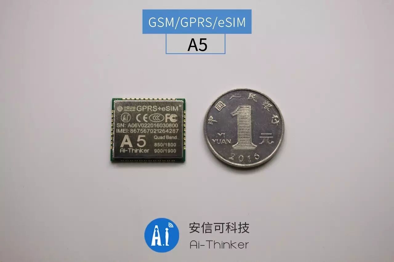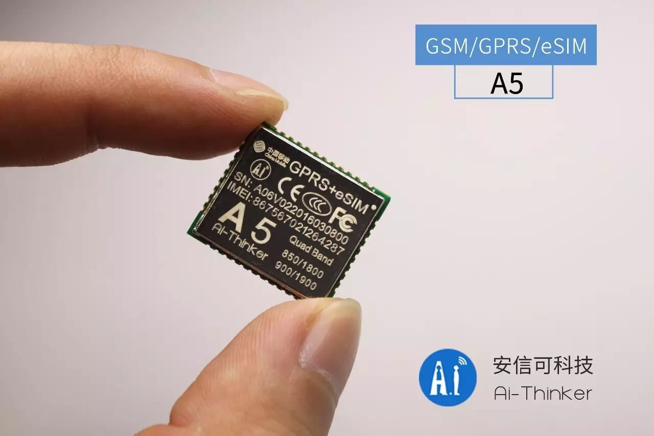 「A5」是安信可科技(Ai-Thinker)基于中移物联网自主研发的 eSIM 物联网芯片 C216B 打造的一款高性能、低成本、小体积的 GSM/GPRS 四频段模组,内置中国移动 eSIM。该模组除了通信数据收发功能之外,还具备时钟同步、信号自检、OneNet 接入等功能,能够为物联网应用提供更高效的数据连接、更简易安全的 SIM 应用、更方便的设备远程维护。