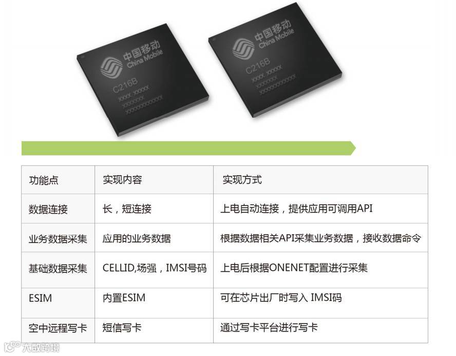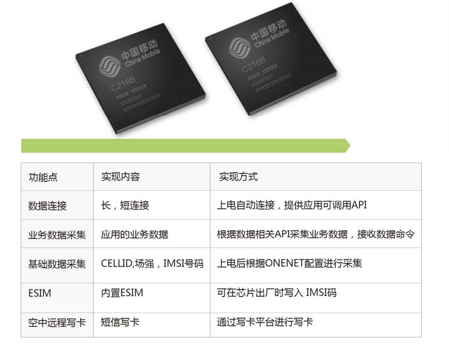 C216B 是中移物联网首款自主研发的 eSIM 物联网芯片,芯片尺寸仅为10*12*1.23mm,虽然体积微小,却具有空中写卡、自动接入中国移动物联网开放平台 OneNET、基础数据采集、低功耗等特色功能,可面向远程抄表、车联网、智能家居、可穿戴、智慧医疗、智慧金融等应用场景,为海量客户提供低成本、低功耗、高安全性、高稳定性、高集成度的终端产品及解决方案。