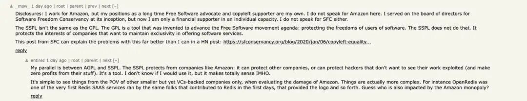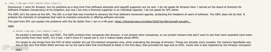 对于社区的反馈,Redis 之父 Antirez 表现得有点愤愤不平,“如果一家小公司采用类似 GPL 的许可证,会被指责违背开源原则,而像亚马逊这样的大公司对开源软件的未来构成重大威胁,却没有任何问题。”