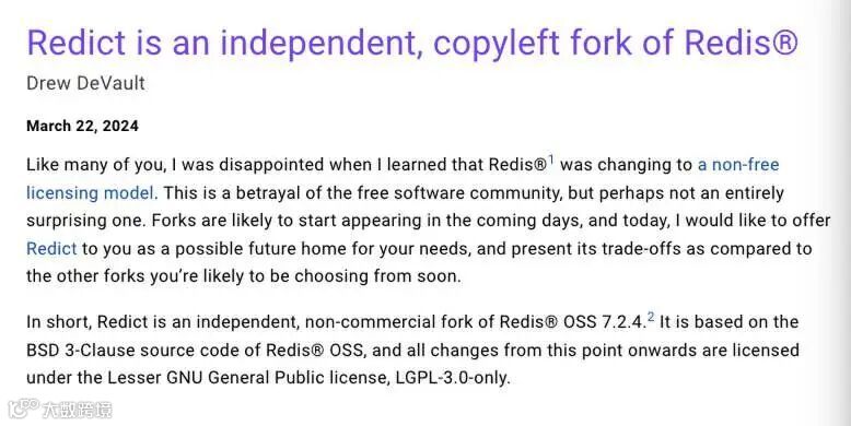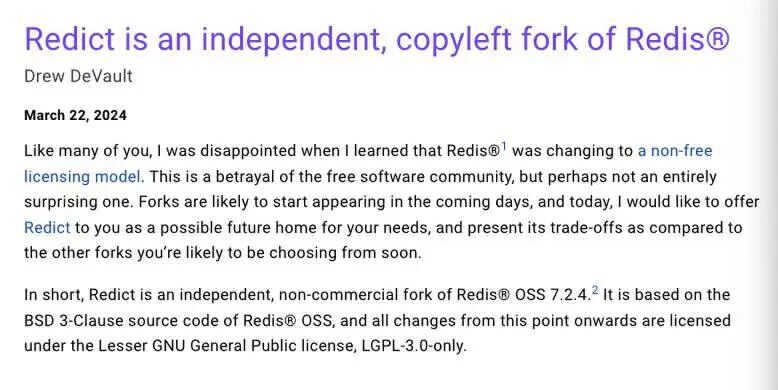 软件开发者 Drew DeVault(曾开发 SourceHut、wlroots 等多个项目,也是一位高产的 FOSS 博主)也迅速参与了 Redis 分叉,相关成果名为“Redict”。他将其描述为“Redis OSS 7.2.4 的一个独立非商业分叉……基于 Redis OSS 的 BSD 3-Clause 源代码……从现在起的所有后续变更均将采用 Lesser GNU 通用公共许可证,即纯 LGPL-3.0 许可。”他还补充称,“以下讨论仍在进行当中……”