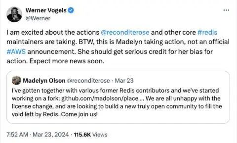 亚马逊首席技术官兼副总裁 Werner Vogels:“一些 Redis 核心维护者正在采取行动,我为他们感到高兴。但这不是 AWS 的官方声明。”
