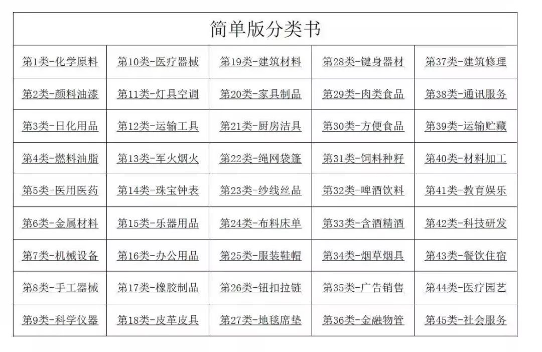 商标类别指的是所要注册的商标所属的行业,我国采用尼斯商品分类,商标注册用商品和服务分类表共分为45类,指向特定的产品与服务,其中1-34是商品类别,35-45是服务类别。商标分类后可便于检索、管理、审查。