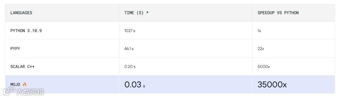 Mojo🔥刚发布时,官方介绍称它能够利用 MLIR,使 Mojo 开发者能够利用向量、线程和 AI 硬件单元。根据测试,Mojo 比 Python 快 35000 倍。