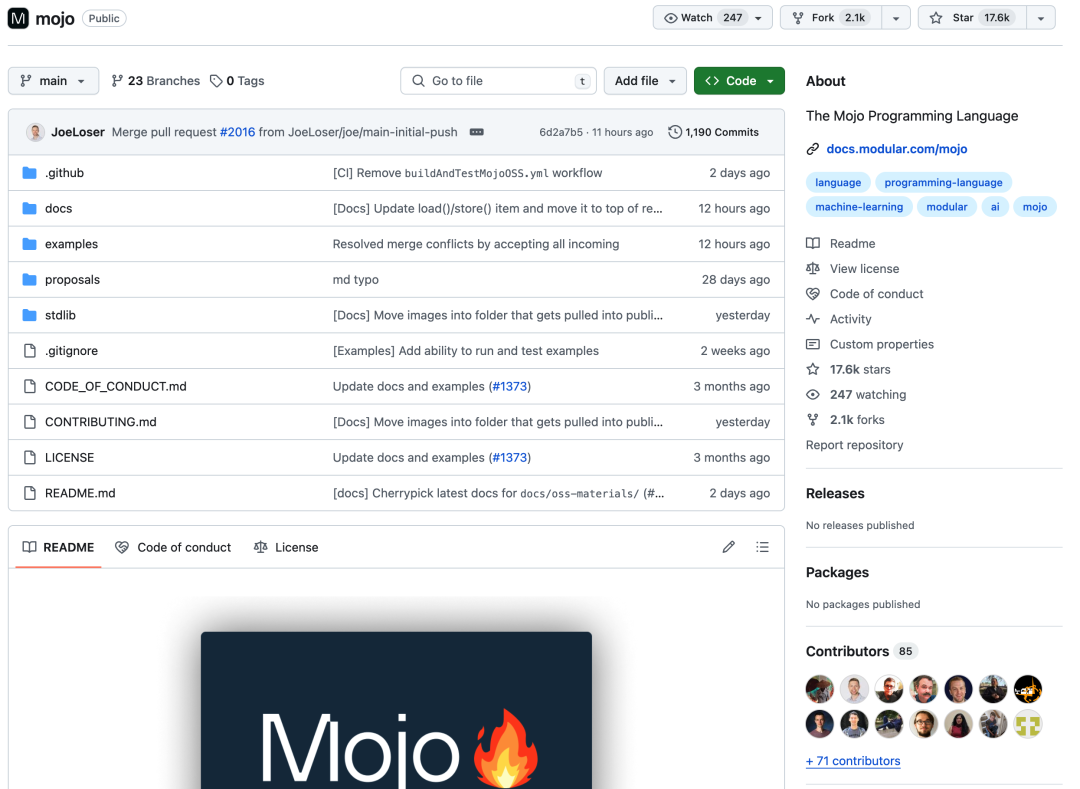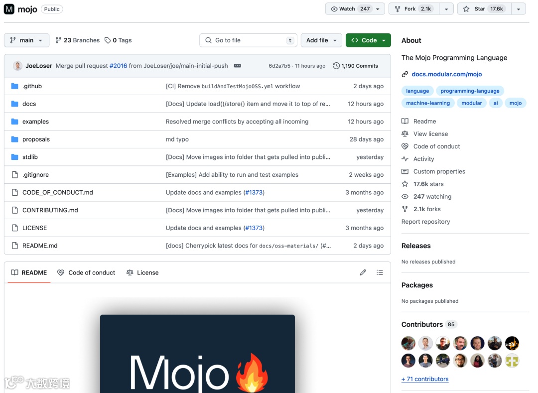 Modular 称他们选择了更彻底的开源方式:允许通过 GitHub pull request 提交外部贡献,鼓励开发者参与到 Mojo 的开发和完善中来,促进社区的壮大。