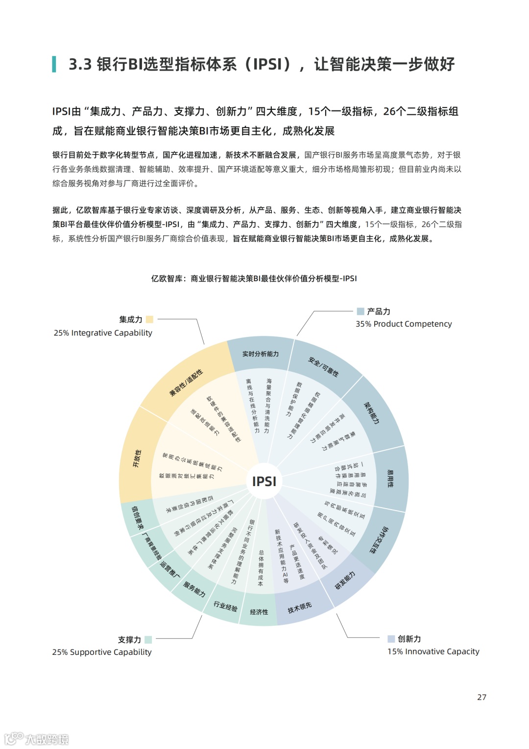 《白皮书》详细阐述了商业银行“统计报表分析”、“局部自助分析”、“全面自助分析”、“智能决策”四大BI发展阶段,为银行智能决策发展情况提供印照路径。受限于数据应用程度影响,大多数银行仍处于局部自助分析阶段,《白皮书》从数据质量、组织文化、数字化工具等方向,深度剖析智能决策建设难点,并提供银行BI平台建设六大核心环节、银行BI选型指标体系(IPSI)与多家银行BI最佳实践,让更多银行不走弯路,助力实现全面自助分析。