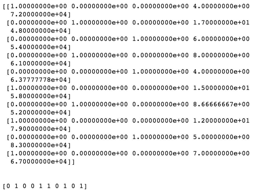 现在,你的那一列数据已经被替换为了这种形式:数据组中的每一个属性数据对应一列,并以 1 和 0 取代属性变量。非常贴心,对吧?如果我们的 Y 列也是如「Y」和「N」的属性变量,那么我们也可以在其上使用这个编码器。