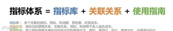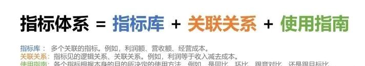 所以,指标体系由三部分构成:指标库、关联关系,以及指标体系的使用指南。