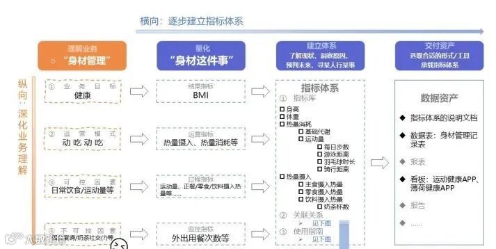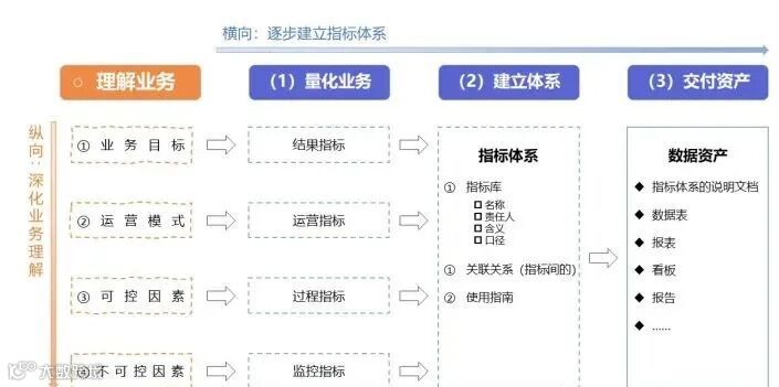 以“业务理解”为起点,横向出发,我们可以经过3个步骤,完成数据资产的交付: