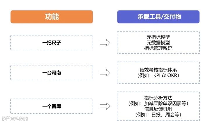尺子:当团队使用一套指标体系时,就可以统一度量衡,减少转化、翻译(口径解释)等工作,降低组织内的沟通成本。承载的工具有:元指标模型、元数据模型、指标管理系统等。