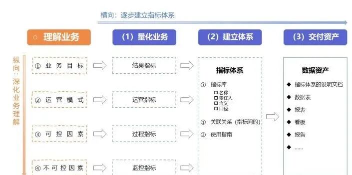 搭建指标体系的过程:搭建指标体系的过程可以分为横纵两个方向;纵向是“深入的理解业务”;横向是“工作流”,分为4个步骤:理解业务、量化业务、建立体系、交付资产。