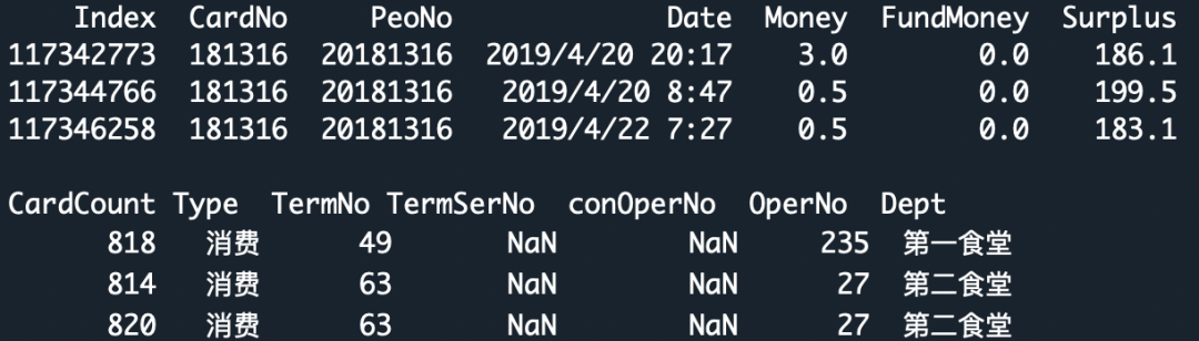data2.columns = ['流水号', '校园卡号', '校园卡编号', '消费时间', '消费金额', '存储金额', '余额', '消费次数', '消费类型', '消费项目编码', '消费项目序列号', '消费操作编码', '操作编码', '消费地点']