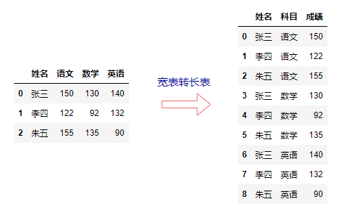 df.melt(id_vars="姓名", var_name="科目", value_name="成绩")