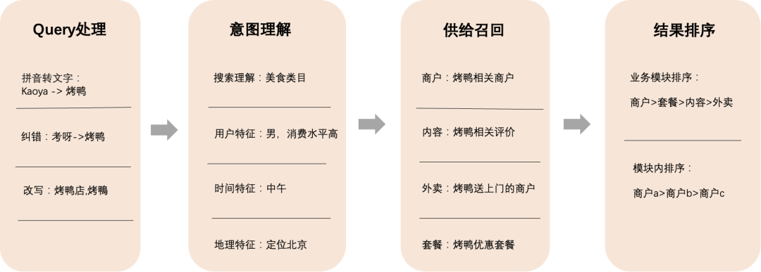 所以系统先按照可能的意图,对每个意图下的内容做了高匹配度商户的圈定召回。最后在按匹配度顺序排出各类供给以及供给下具体内容的先后顺序做内容展示。