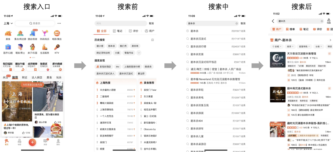 搜索前:即搜索起始页,这个页面一般有两个产品定位:扩认知(比如点评搜索起始的发现模块,主要是推荐一些平台强运营的关键词,建立用户点评可以搜索商户以外内容的认知)。提效率(比如历史搜索关键词)。